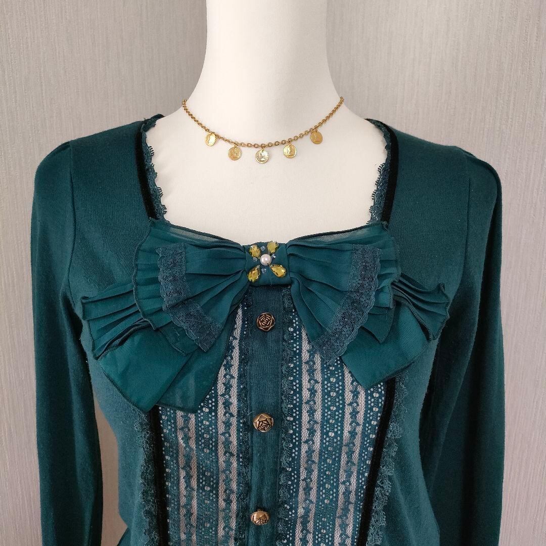 フリル付きリボンデザインのダークグリーン長袖トップス。
