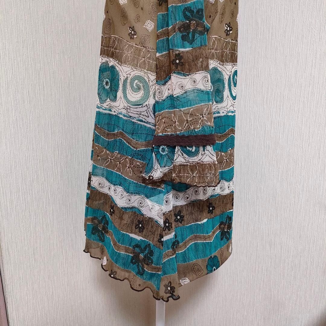 総柄プリントのチュール素材のチュニックです。襟、袖口のレースや胸元のウッドビーズのついたリボンが可愛いアイテムです。