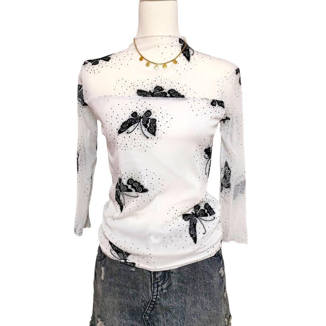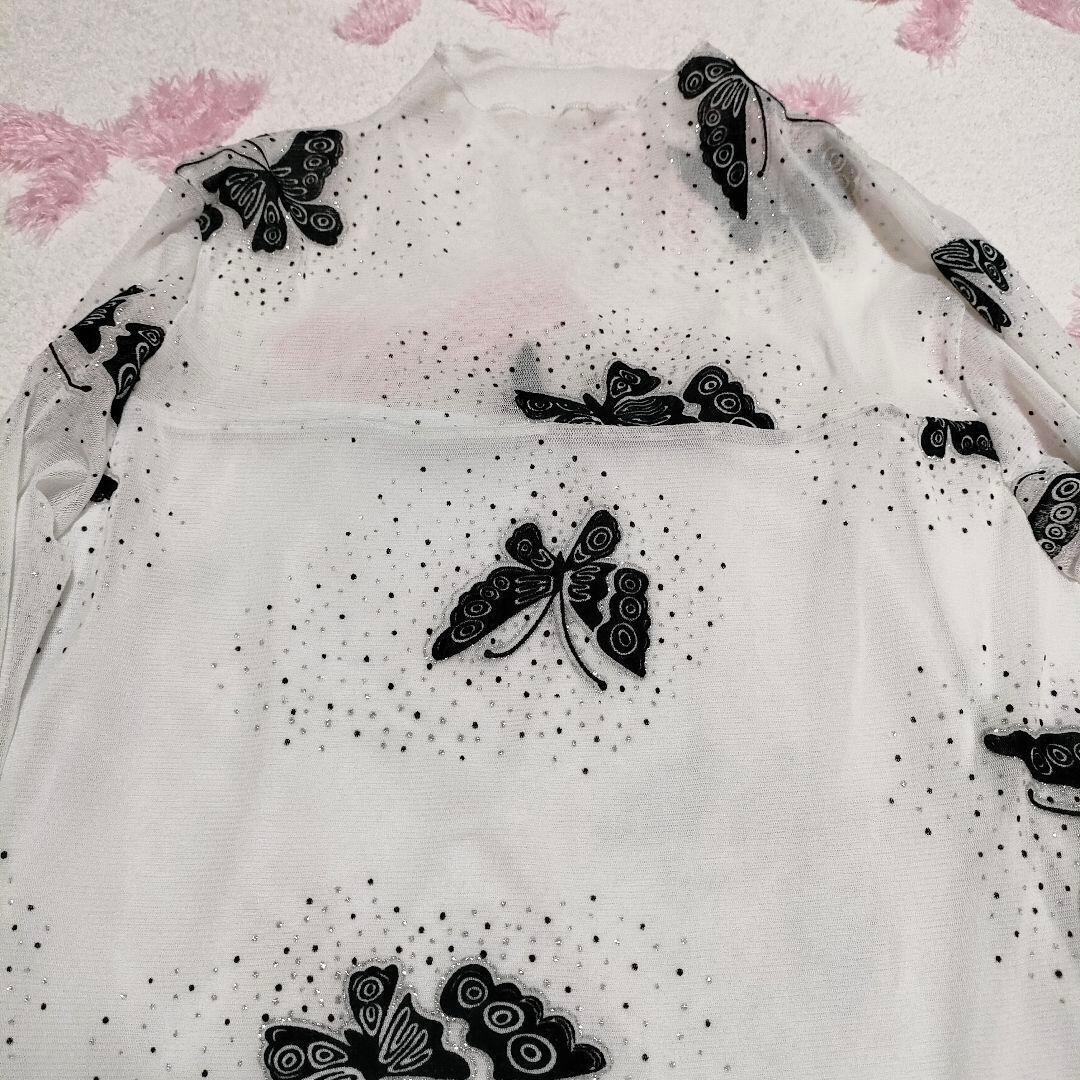 蝶のプリントが特徴的なシースルー長袖トップス。