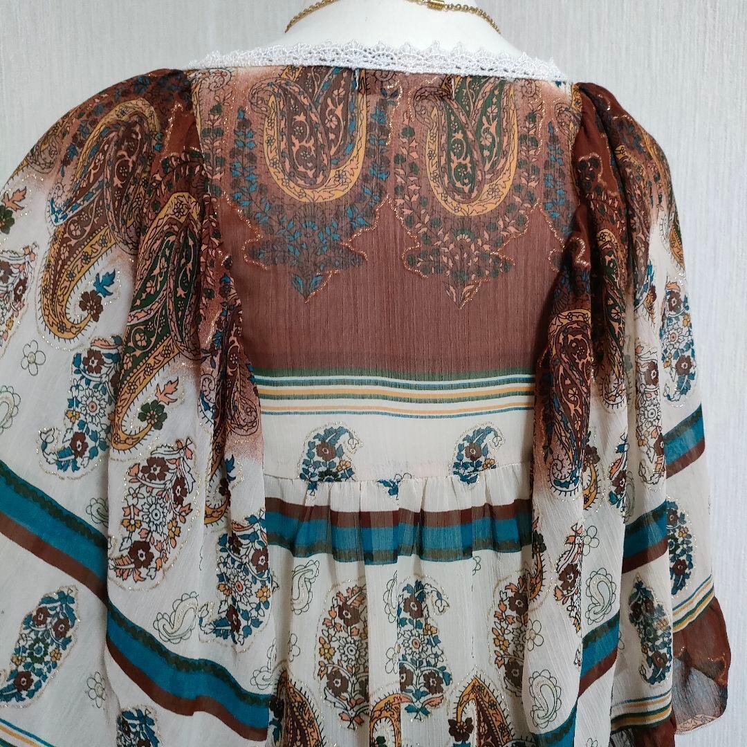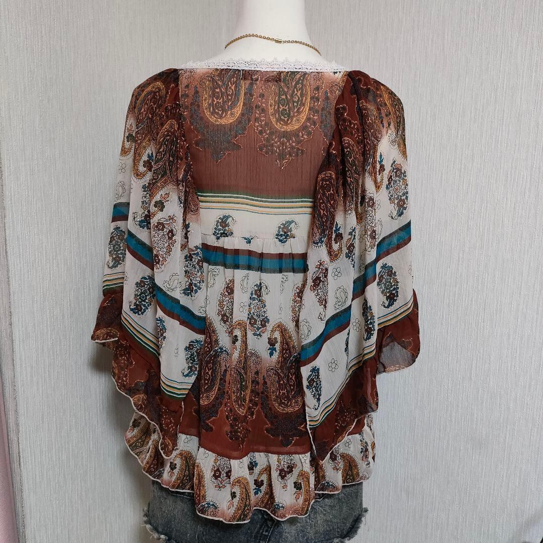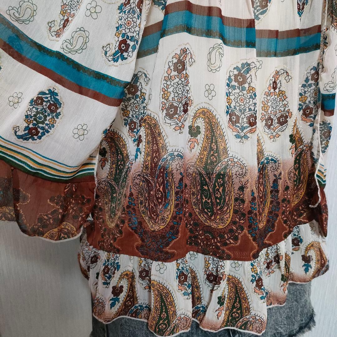 ペイズリー柄のシフォンブラウスです。袖は筒状ではなく、ノースリーブにケープのように被さったようなデザインです。総柄のシフォン地にラメプリントもされていてキラキラしていて可愛いアイテムです。裏地なし。