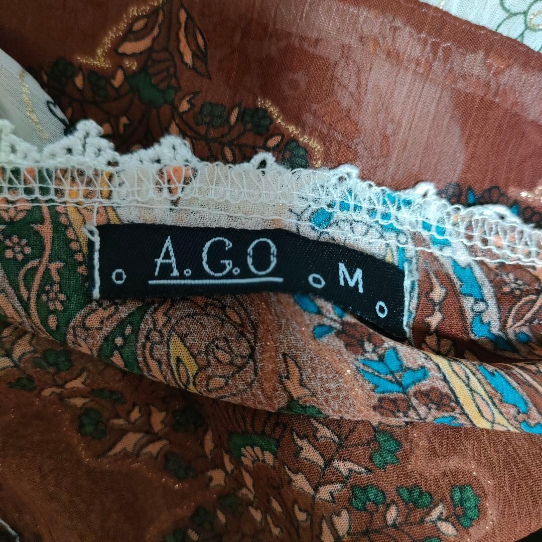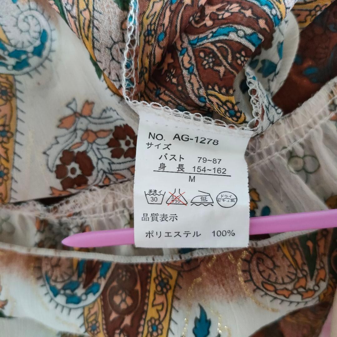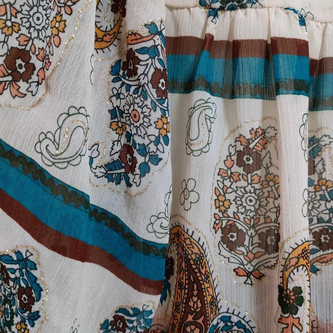 ペイズリー柄のシフォンブラウスです。袖は筒状ではなく、ノースリーブにケープのように被さったようなデザインです。総柄のシフォン地にラメプリントもされていてキラキラしていて可愛いアイテムです。裏地なし。