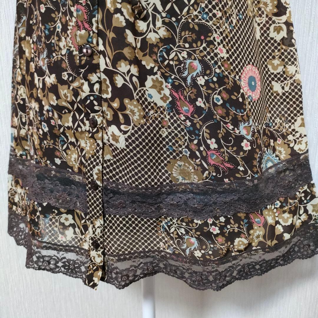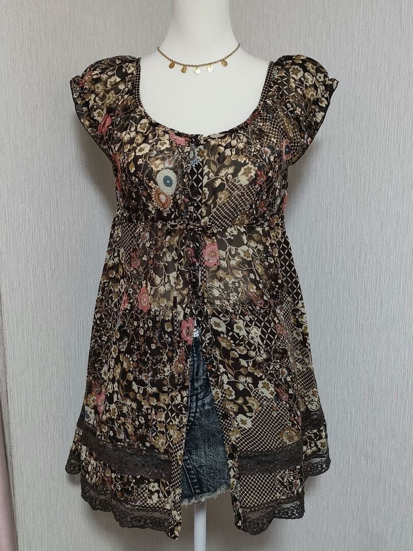 レトロポップな総柄が可愛いチュニック(ワンピース)です。袖口のフリルや、裾のレースなど細部まで可愛いアイテムです。総柄で見えづらいですが、ウエストリボンありです。裏地なし。前開きになります。
