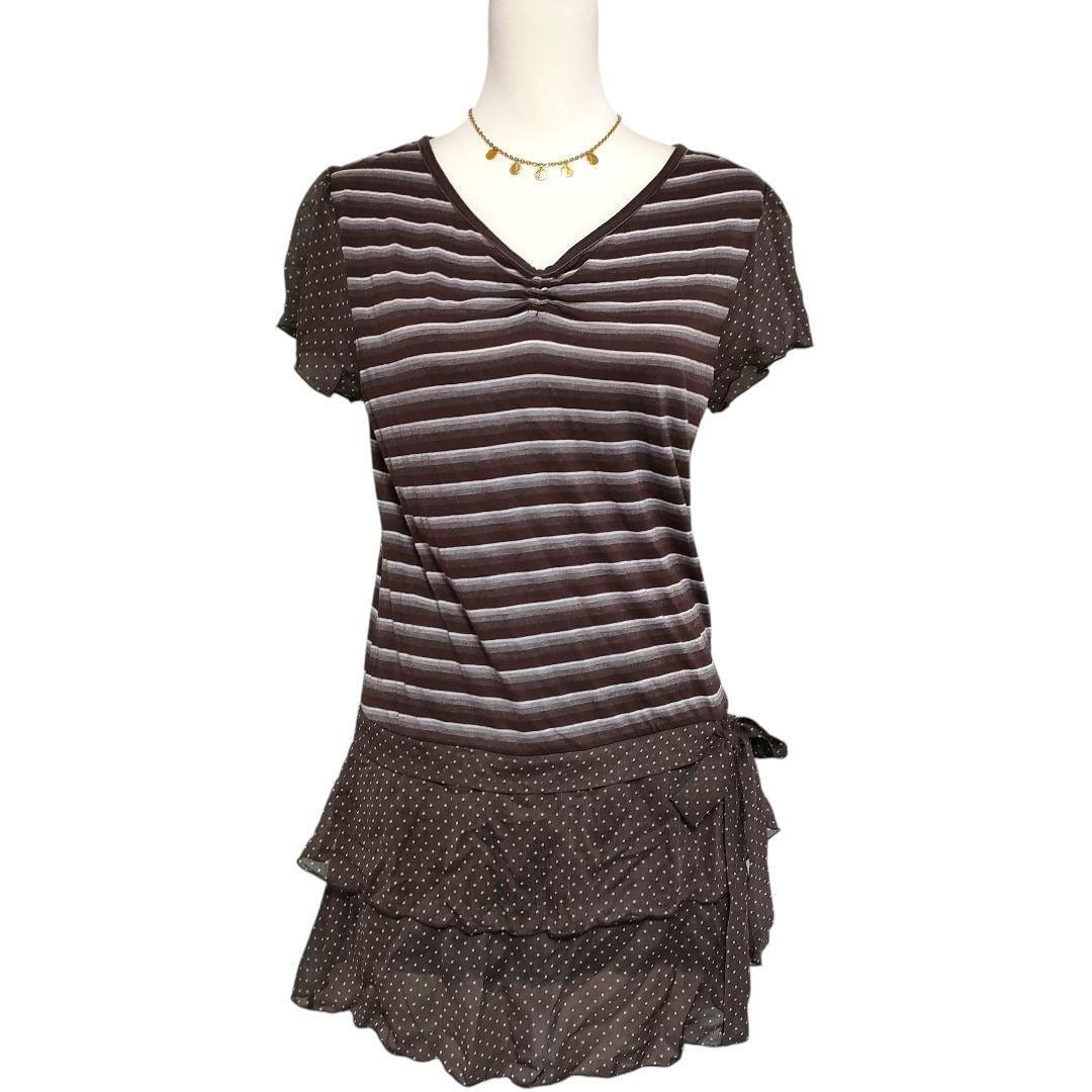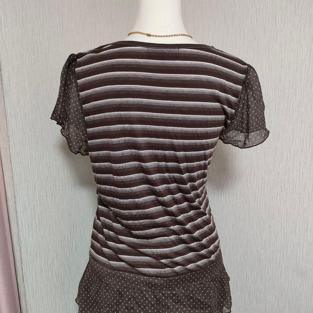 y2k森ガール グランジ ボーダー×ドット柄フリル 半袖ワンピース チュニック