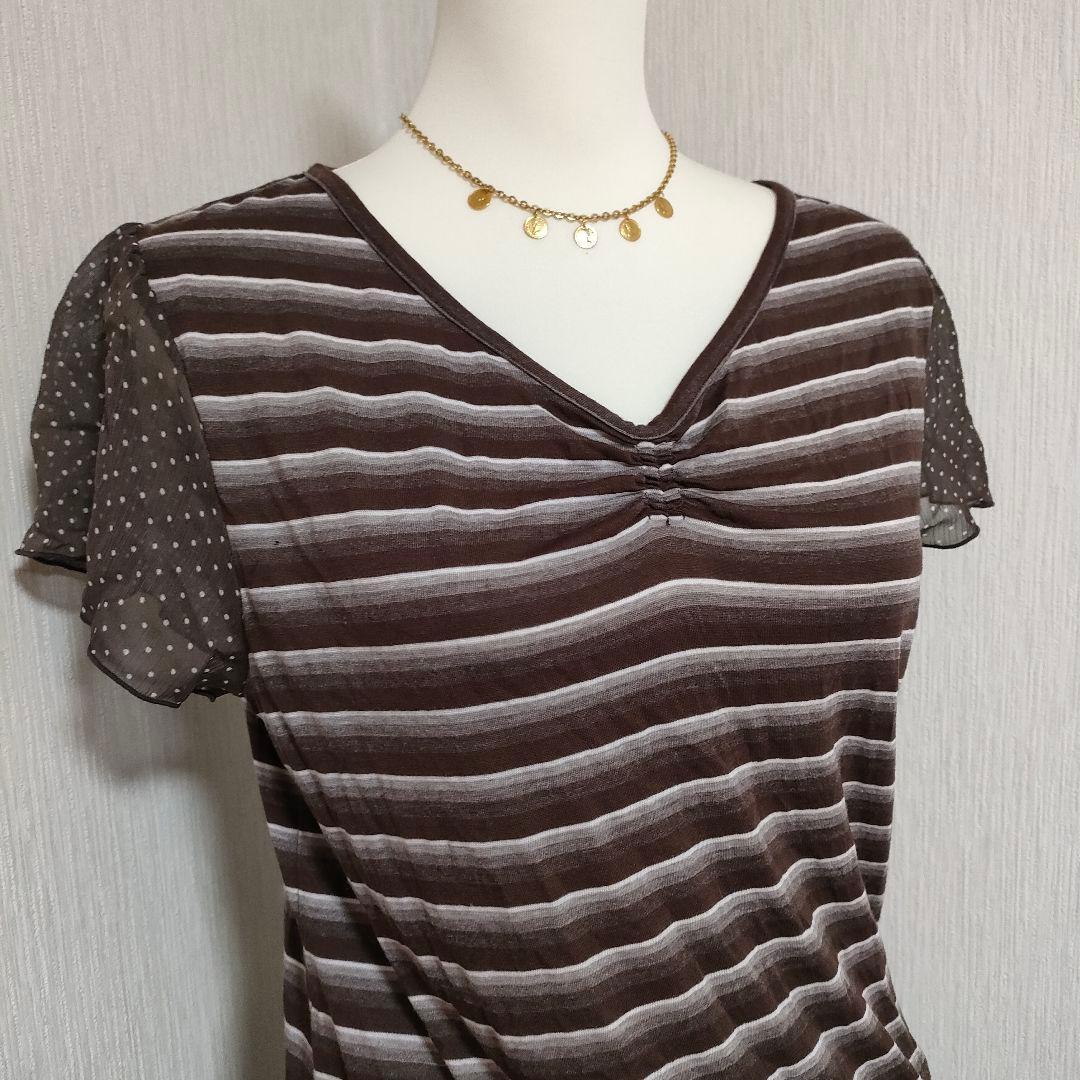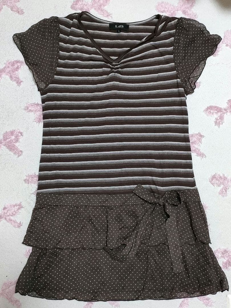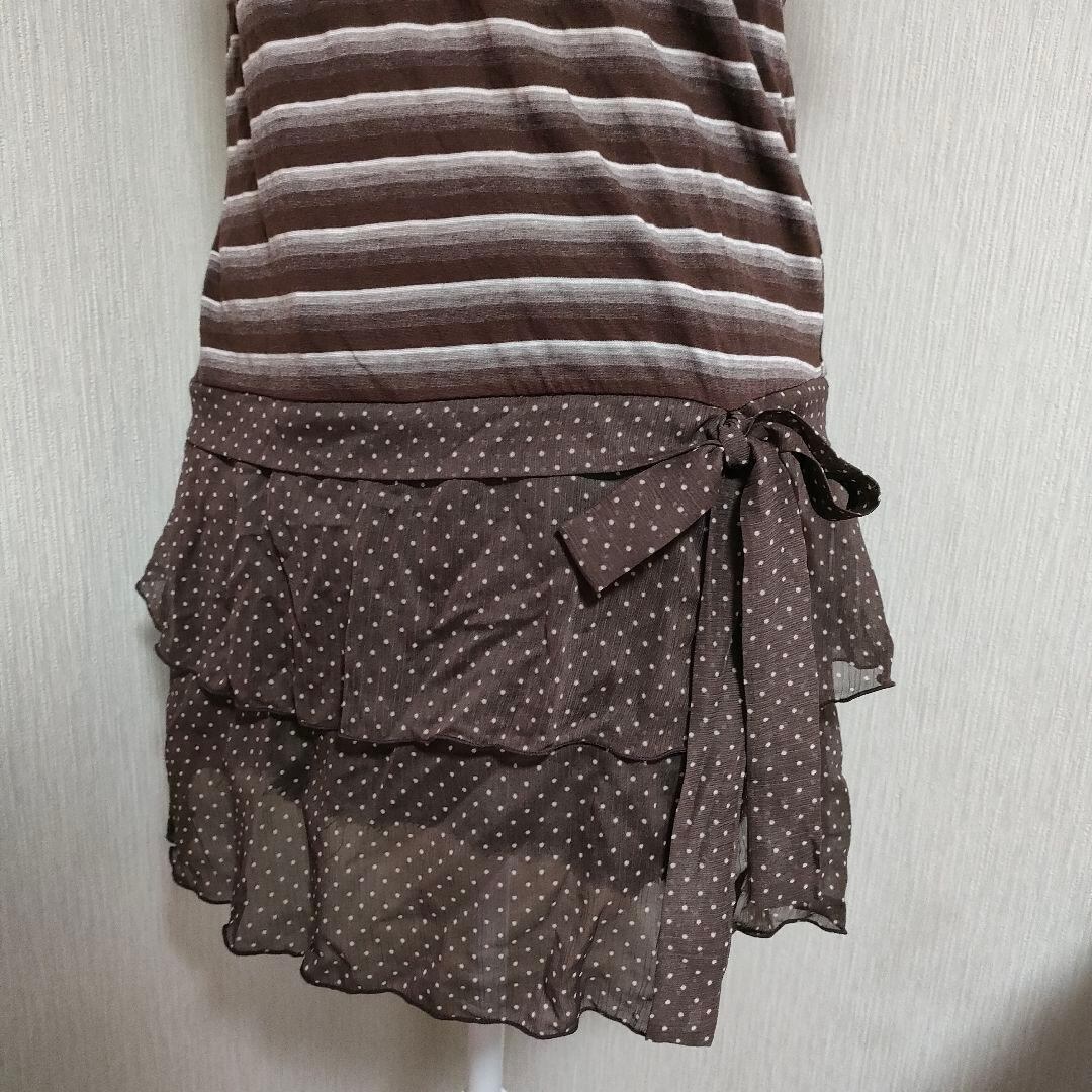 薄手のTシャツとシフォンのティアードスカートがドッキングしたデザインのワンピース(チュニック)です。スカート部分のみ裏地あり。リボンは解けますが取り外し不可。