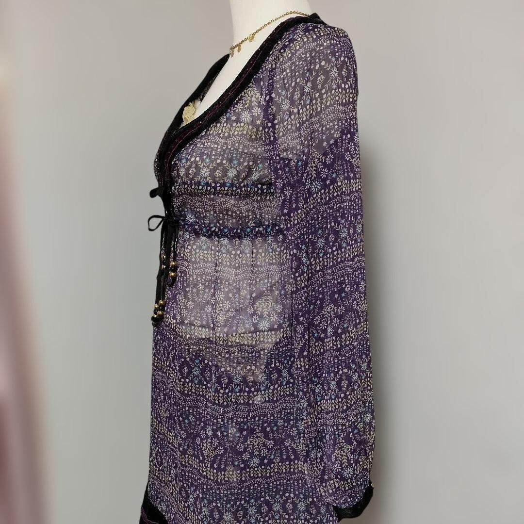 ボヘミアンスタイルの紫色チュニック、リボンとビーズの装飾付き。