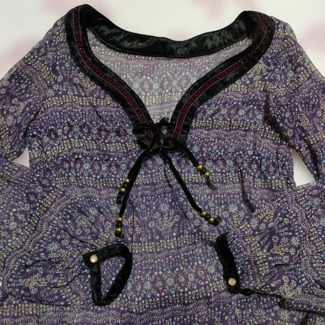 ベロア ボヘミアンスタイル 紫色 チュニック 長袖 リボン シフォン